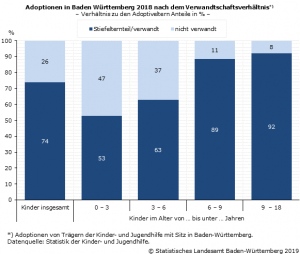 Nach Feststellung des Statistischen Landesamtes wurden im Jahr 2018 von Trägern der Kinder- und Jugendhilfe mit Sitz in Baden-Württemberg 486 Adoptionen vorgenommen (−5 % gegenüber 2017) und damit so wenige wie noch nie seit Erhebungsbeginn.