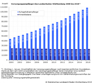 Nach Angaben des Statistischen Landesamtes Baden-Württemberg gab es im Januar 2018 insgesamt 131 515 Versorgungsempfängerinnen und -empfänger im Land. Dies waren rund 4 600, bzw. 3,6 % mehr als noch ein Jahr zuvor. Den größten Teil der Versorgungsempfängerinnen und -empfänger bildeten mit 108 615 die Ruhegehaltsempfängerinnen und -empfänger1. Im Jahr zuvor waren es noch 104 210 Ruhegehaltsempfängerinnen und -empfänger. Die Anzahl der Hinterbliebenen, die sich aus Witwen/Witwer und Waisen zusammensetzen, die versorgungsberechtigt sind, stieg leicht um 175 auf 22 900. Vor 10 Jahren gab es mit 23 425 noch mehr Hinterbliebene als heute. Dagegen hat sich die Anzahl der Ruhegehaltsempfängerinnen und -empfänger seit 2008 um mehr als 50 % erhöht.