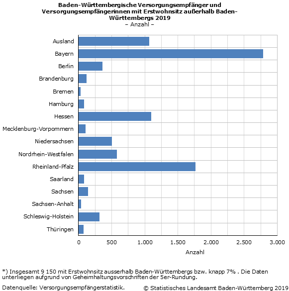Insgesamt 9 150 ehemalige Beamtinnen und Beamte hatten zum 1. Januar 2019 ihren Erstwohnsitz außerhalb von Baden-Württemberg, knapp 7 % aller Versorgungsempfängerinnen und -empfänger. Davon wohnten allein 2 785 in Bayern, im Ausland rund 1 065 und lediglich 145 in Sachsen.