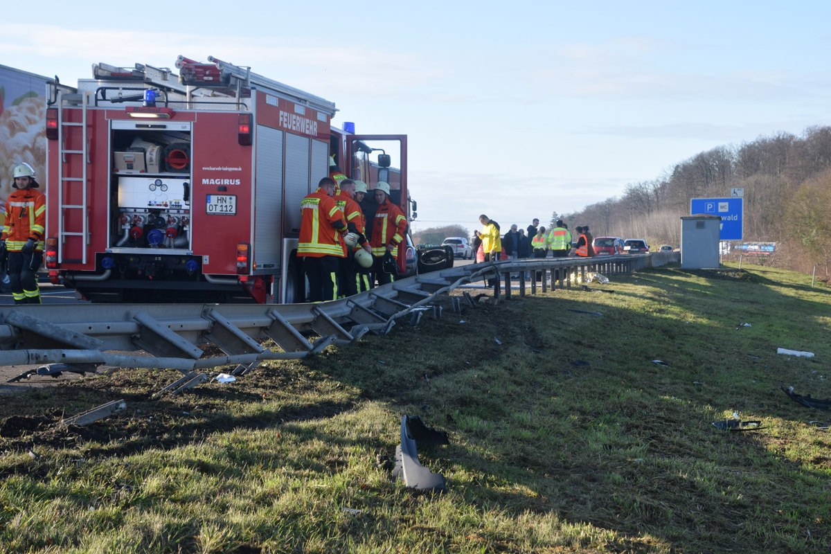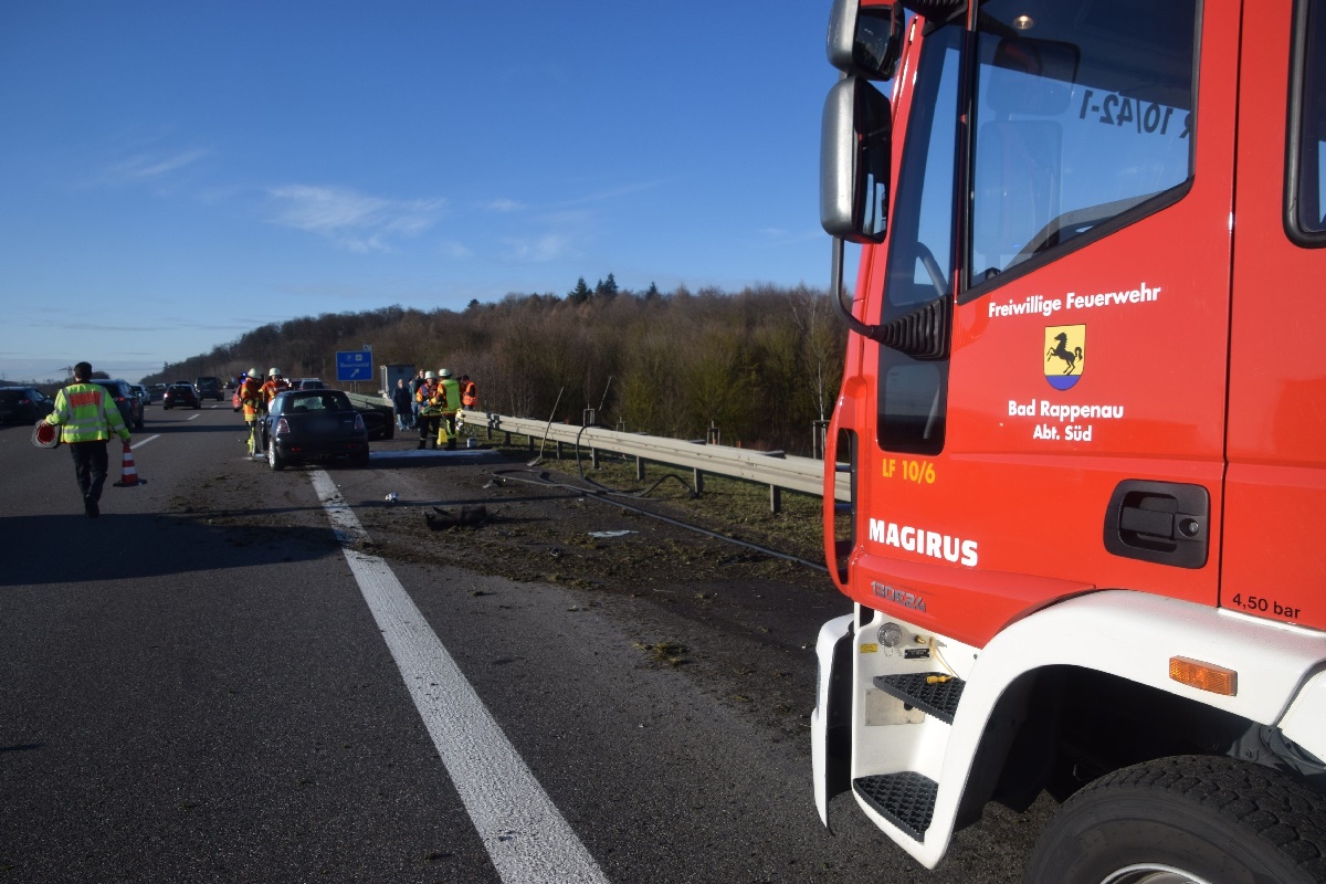 A6/Grombach. (red) Ins Krankenhaus eingeliefert werden musste eine Autofahrerin aus dem Rhein-Neckar-Kreis nach einem Unfall am Samstagnachmittag auf der A6. Die Frau hatte kurz nach 13 Uhr die Bundesautobahn zwischen Bad Rappenau und Sinsheim-Steinsfurt in Richtung Mannheim befahren. Wie ein Sprecher des Polizeipräsidiums Heilbronn auf Nachfrage mitteilte, hatte rund 600 Meter vor der Abfahrt zum Rastplatz Bauernwald ein Fahrzeug vor ihr eingeschert. Um einen Zusammenstoß zu vermeiden bremste sie ihren Wagen, der in der Folge zu schliddern begann. Der Mini Cooper kam nach rechts von der Fahrbahn ab und prallte mit hoher Wucht in die Schutzplanken. Das völlig demolierte Fahrzeug schleuderte zurück und blieb auf der rechten Fahrspur stehen. Autofahrer handelten umsichtig und stellten sich zwischen die Fahrspuren zum Warnen des nachfolgenden Verkehrs. Die Unfallfahrerin konnte sich wie durch ein Wunder selbst aus dem demolierten Wagen retten. Durch eine Rettungswagenbesatzung des DRK Bad Rappenau wurde sie erstversorgt und zur weiteren Behandlung mit leichten Verletzungen in das Sinsheimer Krankenhaus eingeliefert. Wegen der ersten Meldung eines qualmenden Fahrzeuges war auch die Freiwillige Feuerwehr Bad Rappenau im Einsatz. „Der Wagen brannte zum Glück nicht, wir haben dennoch den Brandschutz sichergestellt und die Fahrbahn gereinigt“, so Feuerwehrkommandant Felix Mann vor Ort. Am Mini entstand Totalschaden in noch unbekannter Höhe. Auch an den dortigen Schutzplanken entstand nicht unerheblicher Sachschaden. Der private Autobahnbetreiber „via6West“ muss sich nun um die Erneuerung kümmern. Da während der Unfallaufnahme eine Fahrspur gesperrt werden musste bildete sich hinter der Unfallstelle ein Stau von rund vier Kilometern Länge.