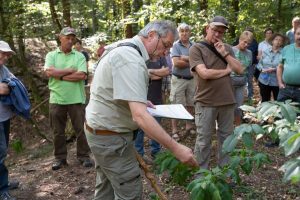 Um Naturschutz und Erholung im Walldorfer Hochholz ging es bei der Waldführung mit Förster Gunter Glasbrenner am vergangenen Samstag, 19. September. Bei der restlos ausgebuchten Veranstaltung fanden sich 35 Interessierte im Waldklassenzimmer in Walldorf ein, darunter viele Familien mit Kindern. Beim anschließenden Rundgang bei schönstem Spätsommerwetter war natürlich der Wald im Klimawandel ein zentrales Thema. Dass viele Baumarten nicht nur unter Trockenheit und Hitze leiden, sondern auch durch Käferbefall und Pilzerkrankungen nachhaltig geschädigt sind, davon konnten sich die Besucherinnen und Besucher vor Ort überzeugen. Aber auch der Umgang mit Neophyten wie Kermesbeere und Spätblühende Traubenkirsche und ihre Herkunft stießen auf großes Interesse der Zuhörerinnen und Zuhörer.