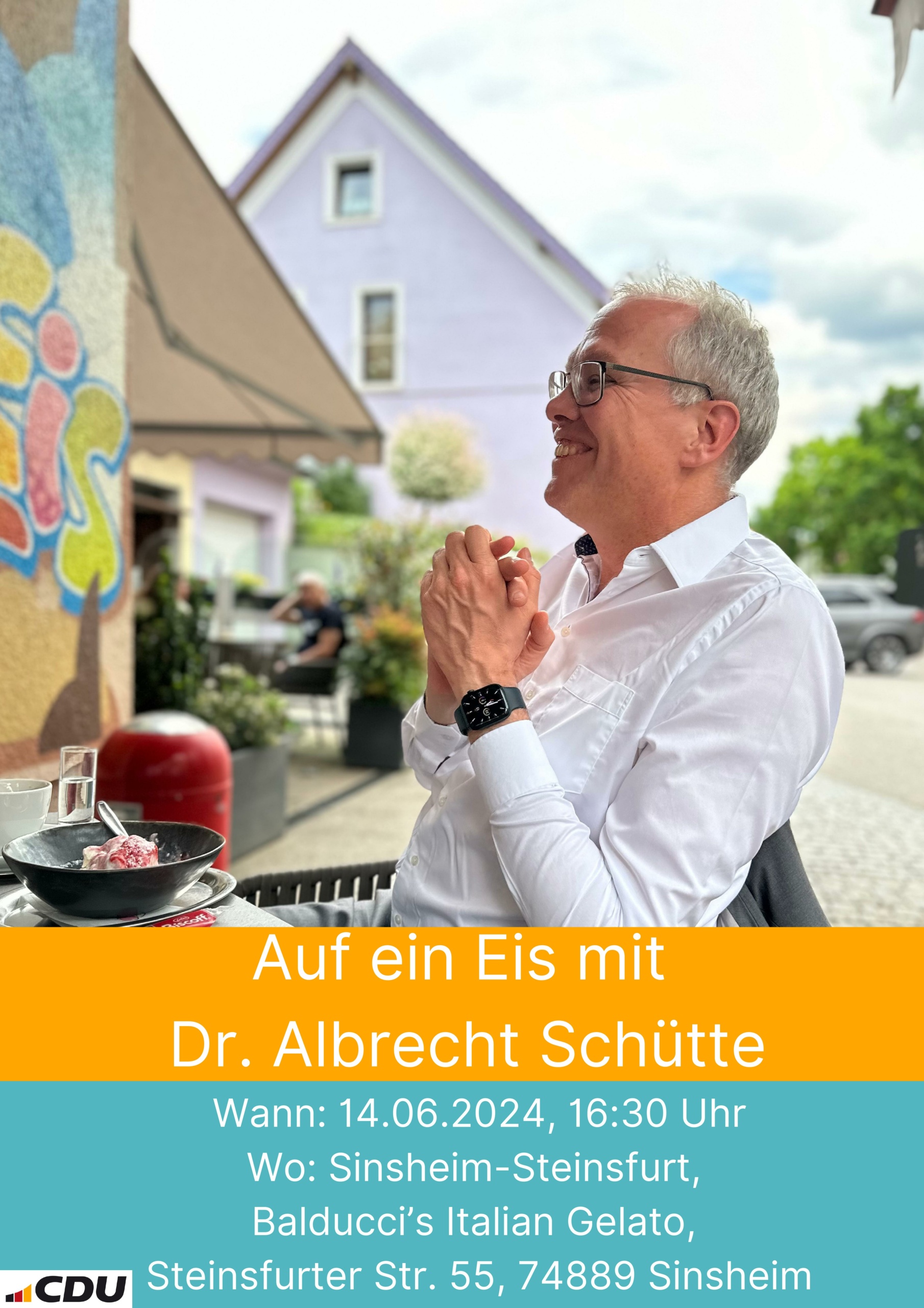 Am Freitag, 14. Juni 2024, lädt der Landtagsabgeordnete Dr. Albrecht Schütte (CDU) alle Interessierten zu einem Eis und Gesprächen ein