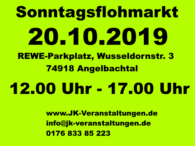 Um der Bevölkerung um Angelbachtal herum, am Kerwe Wochenende einen schönen Sonntagnachmittag zu bieten, veranstaltet die Fa. JK-Veranstaltungen am Sonntag, den 20.10.2019 einen Sonntagsflohmarkt in Angelbachtal.