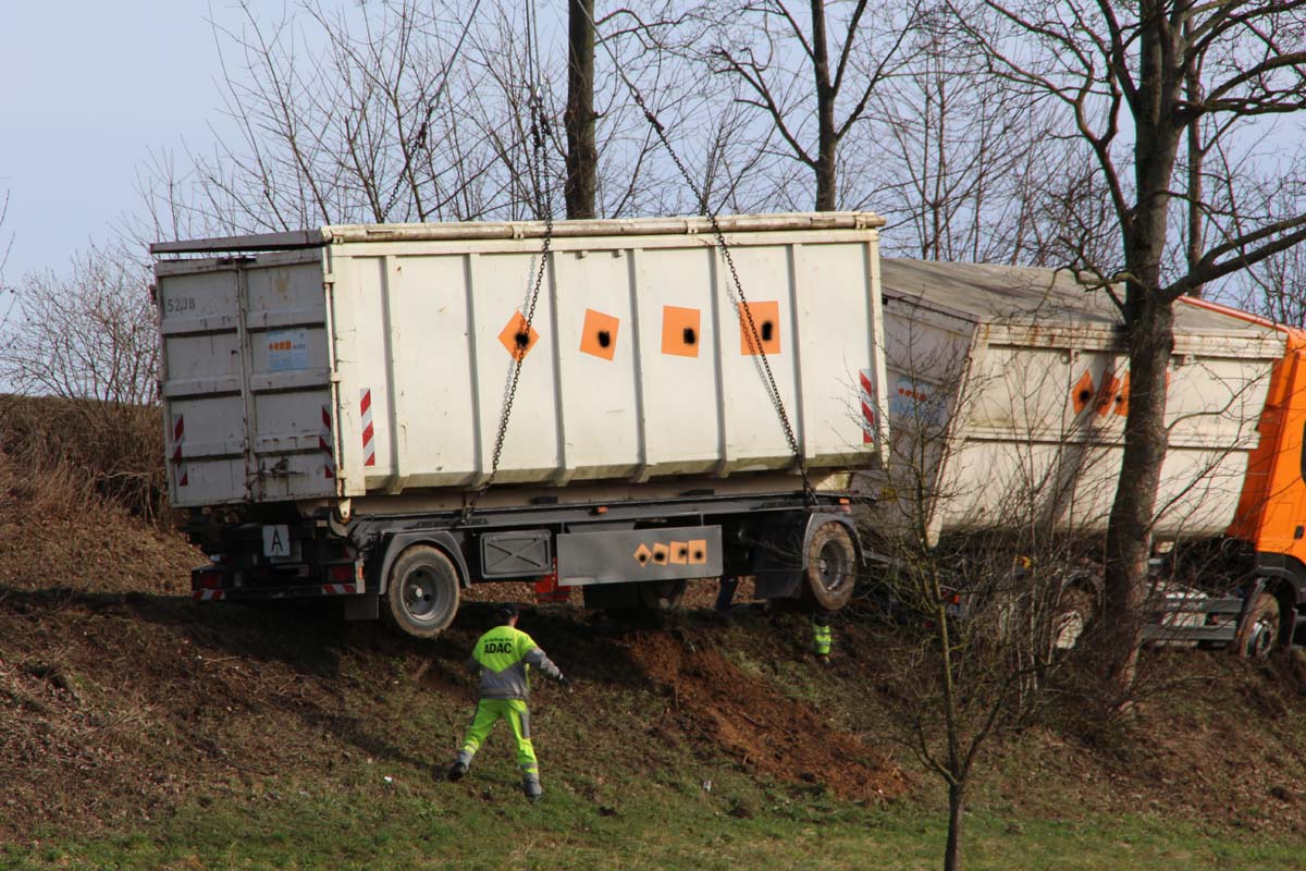 LKW und Hänger konnten relativ unbeschadet geborgen werden, nachdem man die Baumkrone etwas gestutzt hatte.