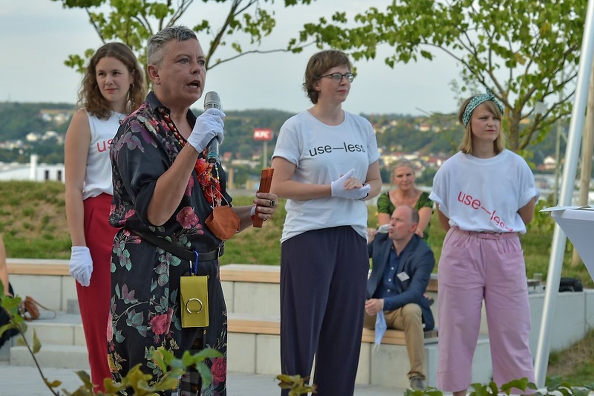 Professorin Martina Glomb bei der Vernissage der Ausstellung „use-less“ in der KLIMA ARENA in Sinsheim mit Team-Mitarbeiterinnen.