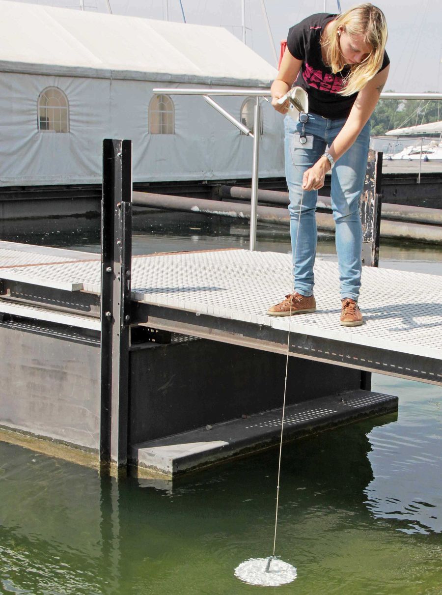 (Quelle: Landratsamt Rhein-Neckar-Kreis): Hygienekontrolleurin Sarah Samuelsen bei der Messung der Sichttiefe eines Badesees im Rhein-Neckar-Kreis