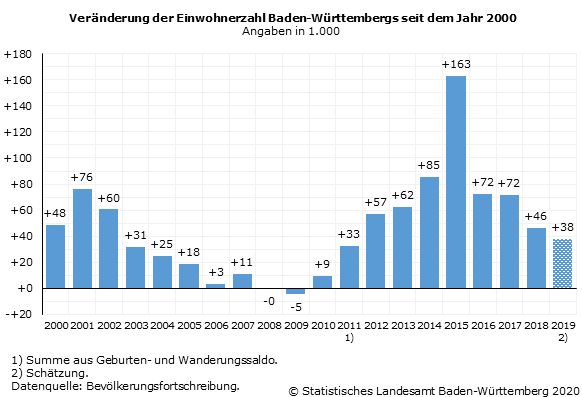 Ende 2019 hatte Baden-Württemberg nach einer Schätzung des Statistischen Landesamtes rund 11,1 Millionen Einwohner. Damit lag die Einwohnerzahl so hoch wie noch nie seit Gründung des Landes im Jahr 1952. Allerdings nahm die Zahl der Baden-Württembergerinnen und Baden-Württemberger im vergangenen Jahr schwächer als in den Vorjahren zu. Mit einem Plus von etwa 38 000 Personen war der Zuwachs so niedrig wie seit dem Jahr 2011 nicht mehr, so das Statistische Landesamt weiter.
