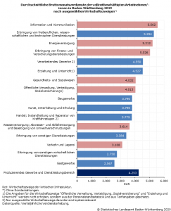 Beim Blick auf die Wirtschaftszweige fällt zunächst auf, dass die Branchen, in denen 2019 Spitzenverdienste erzielt wurden, teilweise auch zu den systemrelevanten Branchen zählen. Vollzeitbeschäftigte im Wirtschaftszweig Information und Kommunikation erhielten einen durchschnittlichen Bruttomonatsverdienst (ohne Sonderzahlungen) von 5 562 EUR, die in der Energieversorgung 5 212 EUR und Vollzeitbeschäftigte der Branche Erbringung von Finanz- und Versicherungsdienstleistungen kamen auf durchschnittlich 5 026 EUR im Monat. Die Beschäftigten im Gesundheits- und Sozialwesen befanden sich dagegen mit 4 032 EUR schon unter dem Durchschnittsverdienst Vollzeittätiger in Baden-Württemberg im Jahr 2019 von 4 253 EUR im Monat. Unter diesem Durchschnitt lagen 2019 ebenfalls die Branchen Handel; Instandhaltung und Reparatur von Kraftfahrzeugen mit 3 779 EUR, die Wasserversorgung; Abwasser- und Abfallentsorgung mit 3 614 EUR, Verkehr und Lagerei mit 3 108 EUR und auch die Öffentliche Verwaltung, Verteidigung, Sozialversicherung mit 4 013 EUR.