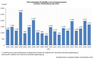 In Baden-Württemberg sind im Sommer 2019 knapp 1 700 Menschen aufgrund hoher Temperaturen verstorben. Damit waren 6,3 % der rund 26.400 Sterbefällen in den Sommermonaten Juni, Juli und August des vergangenen Jahres durch »Hitze« mitverursacht. Dies ergab eine vom Statistischen Landesamt für den Zeitraum 2000 bis 2019 durchgeführte Analyse zur Ermittlung der Sterbefälle, bei denen Wärmebelastung eine Rolle gespielt hat (vgl. methodischer Ansatz).