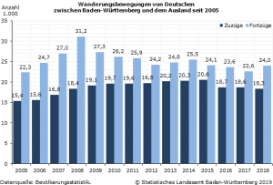 Allerdings handelt es sich bei den Fortzügen von deutschen Staatsangehörigen sicherlich nicht immer um dauerhafte Umzüge im Sinne einer Auswanderung.1 Vielmehr ist ein Teil der Auslandsaufenthalte – etwa aus beruflichen Gründen – nur vorübergehend, denen nach einer gewissen Zeit eine Rückkehr nach Deutschland folgt. So zogen im Jahr 2018 immerhin etwas mehr als 18 000 deutsche Staatsbürger aus dem Ausland nach Baden-Württemberg zurück. Der Wanderungsverlust lag damit im vergangenen Jahr bei 5 600 Personen, im Zeitraum 2005 bis 2018 betrug das Minus gut 92 000 Personen.