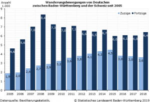 Bevorzugtes Zielland war im Jahr 2018 – wie bereits in den Vorjahren – die Schweiz. In das südliche Nachbarland zogen per Saldo knapp 2 800 deutsche Staatsbürgerinnen und Staatsbürger aus Baden-Württemberg. Es folgten mit deutlichem Abstand Wanderungsverluste gegenüber Österreich (ca. −700) sowie Frankreich und Großbritannien (jeweils ca. −200). Dagegen zählten die Vereinigten Staaten im vergangenen Jahr nicht mehr zu den beliebtesten »Auswanderungszielen«; vielmehr war die Wanderungsbilanz Baden-Württembergs gegenüber den USA im Jahr 2018 sogar leicht positiv, während sie in den Jahren zuvor noch deutlich negativ war.