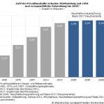 Betrachtet man die langfristige Entwicklung der Zahl der Privathaushalte seit 1950, dann zeigt sich, dass die Zahl der Privathaushalte seit Bestehen des Landes kontinuierlich gestiegen ist und zwar um durchschnittlich rund 47 000 Haushalte jährlich. Von 2017 bis 2030 wird ein deutlich abgeschwächtes Wachstum von nur noch 15 000 Haushalten jährlich erwartet. Auch die Veränderung der Anteile einzelner Haushaltsgrößen, dürfte sich künftig weniger dynamisch entwickeln.