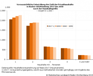 (zg) Nach den Ergebnissen des Mikrozensus gab es im Jahr 2017 fast 5,3 Millionen (Mill.) Privathaushalte in Baden-Württemberg. Deren Zahl könnte nach der Vorausrechnung des Statistischen Landesamtes noch bis etwa 2045 um annähernd 300 000 auf knapp 5,6 Mill. ansteigen. Danach wird ein leichter Rückgang erwartet. Die Haushaltszahl im Jahr 2050 könnte um annähernd 290 000 höher als im Basisjahr 2017 liegen. Die Einwohnerzahl wird in diesen Zeitraum voraussichtlich »nur« um rund 200 000 Personen angestiegen sein, so das Statistische Landesamt weiter.
