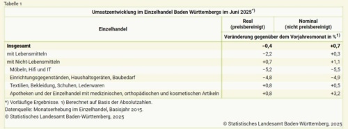 Nach Angaben des Statistischen Landesamtes lag der reale Umsatz des baden-württembergischen Einzelhandels im Juni 2025 um 0,4 % unter dem Niveau des Vorjahresmonats. Nominal wurde ein Umsatzplus von 0,7 % erzielt. Der Juni 2025 hatte mit 23 Verkaufstagen zwei weniger als der Juni 2024 mit 25 Tagen.