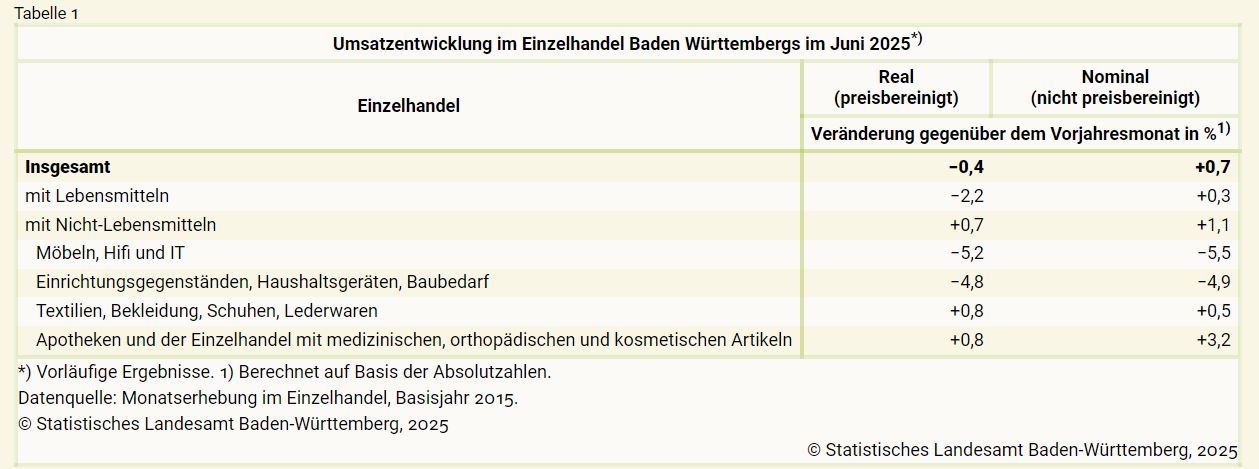 Nach Angaben des Statistischen Landesamtes lag der reale Umsatz des baden-württembergischen Einzelhandels im Juni 2025 um 0,4 % unter dem Niveau des Vorjahresmonats. Nominal wurde ein Umsatzplus von 0,7 % erzielt. Der Juni 2025 hatte mit 23 Verkaufstagen zwei weniger als der Juni 2024 mit 25 Tagen.