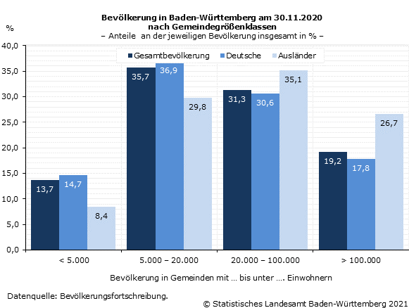 Annähernd jede fünfte Person in Baden-Württemberg lebt in einer der neun Großstädte des Landes mit mehr als 100 000 Einwohnerinnen und Einwohner. Bei den ausländischen Staatsangehörigen sind es sogar mehr als ein Viertel, da diese überdurchschnittlich oft in der Nähe der Arbeitsplatzzentren und damit in den größeren Städten leben.