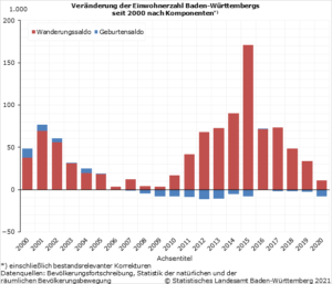 Dagegen ging der Wanderungsgewinn Baden-Württembergs im vergangenen Jahr im Vergleich zu den Vorjahren – sicherlich ebenfalls durch die Pandemie mitverursacht – weiter zurück und lag nur noch bei etwa 10 600 Personen.3 Im Jahr 2019 zogen noch rund 33 500 und im Jahr 2018 ca. 48 300 Personen mehr zu als fort, in den Jahren 2016 und 2017 waren es sogar noch per Saldo jeweils über 70 000 Personen.