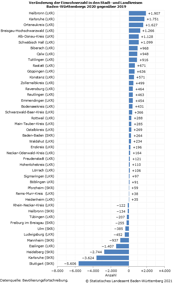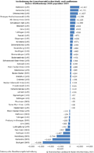 Von den 44 Stadt- und Landkreisen Baden-Württembergs konnten 33 ihre Bevölkerungszahl im vergangenen Jahr steigern. Am höchsten war das Plus in den Landkreisen Heilbronn und Karlsruhe sowie im Ortenaukreis mit jeweils mehr als 1 500 Personen.S2 Auffällig ist, dass zu den 11 Kreisen, deren Einwohnerzahl zurückgegangen ist, immerhin 7 der 9 Großstädte im Südwesten zählen. Nach Einschätzung des Statistischen Landesamtes dürfte diese Entwicklung vor allem im Zusammenhang mit der in den vergangenen Jahren zunehmenden Wohnungsknappheit in den Zentren und den damit verbundenen enormen Kostensteigerungen für das Wohnen zu sehen sein.