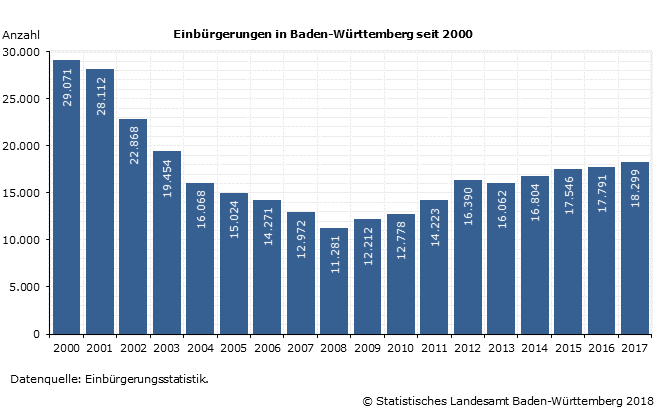 In Baden-Württemberg wurden im Verlauf des vergangenen Jahres 18 299 Ausländerinnen und Ausländer eingebürgert. Damit ist die Zahl der eingebürgerten Personen nach Angaben des Statistischen Landesamtes zum vierten Mal in Folge angestiegen. Die Einbürgerungszahl lag dadurch im Südwesten so hoch wie seit dem Jahr 2003 nicht mehr. Gegenüber dem Jahr 2000 haben sich die Einbürgerungen allerdings um über ein Drittel verringert (Schaubild 1).1