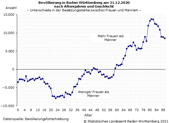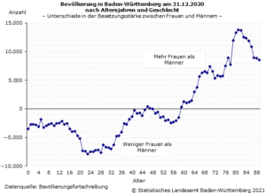 Für den höheren Anteil der Frauen an der Gesamtbevölkerung ist deren höhere Lebenserwartung entscheidend: Ein neugeborenes Mädchen kann heute in Baden-Württemberg auf eine durchschnittliche Lebenserwartung von 84,2 Jahren hoffen, bei den Jungen sind es im Schnitt 79,9 Jahre und damit immerhin 4,3 Jahre weniger. Allerdings hat sich die Lebenserwartung der Männer an die der Frauen in den letzten Jahrzehnten etwas angenähert – mit der Konsequenz, dass sich auch die Geschlechterproportion immer stärker angeglichen hat.