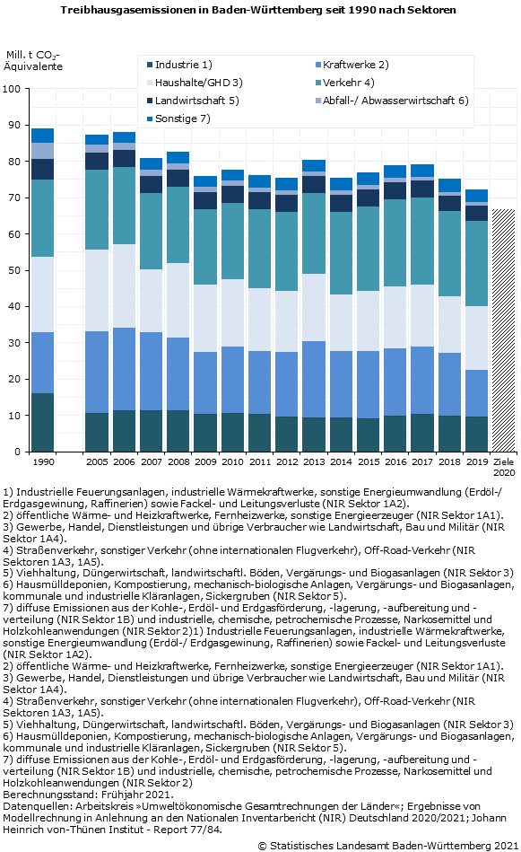 Der Rückgang der gesamten Treibhausgas(THG)-Emissionen in Baden-Württemberg hat sich nach 2017 stark beschleunigt. Nach vorläufigen Berechnungen des Statistischen Landesamtes lagen die THG-Emissionen im Jahr 2019 bei 72,2 Millionen (Mill). Tonnen CO2-Äquivalenten. Sie sind damit im Vergleich zum Vorjahr um rund 3 Mill. Tonnen bzw. 4 % zurückgegangen. Gegenüber dem Referenzjahr 1990 sanken die Emissionen um knapp 19 % (17 Mill. Tonnen CO2-Äquivalente). Das war der mit Abstand niedrigste Wert seit 1990. Sogar das durch die Wirtschaftskrise geprägte niedrige Emissionsniveau 2009 wurde deutlich unterschritten (−3,8 Mill. Tonnen gegenüber 2009). Das Klimaschutzgesetz Baden-Württembergs sieht eine Reduktion der THG-Emissionen um 25 % bis 2020 bezogen auf 1990 vor. Um die THG-Minderungsziele der Landesregierung bis 2020 zu erreichen, müssten noch weitere 5,4 Mill. Tonnen CO2-Äquivalenten (−7,5 %) gegenüber 2019 reduziert werden.