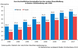 Im Jahr 2017 waren die Männer bei der ersten Eheschließung im Schnitt 33,6 Jahre und die Frauen 31,2 Jahre alt. Damit ist das Durchschnittsalter, in dem ledige Männer und Frauen vor den Standesbeamten treten, in den letzten Jahrzehnten deutlich angestiegen. Noch Mitte der 1980er-Jahre lag das durchschnittliche Heiratsalter gut 6 Jahre niedriger. Dieser Trend hin zu einer späteren Heirat dürfte unter anderem auf die im Schnitt gestiegene Ausbildungsdauer zurückzuführen sein, aber auch darauf, dass immer mehr Partner – im Gegensatz zu früher – zunächst in einer nichtehelichen Lebensgemeinschaft leben. Allerdings gab es auch im Jahr 2017 Paare, die sehr jung geheiratet haben: Bei immerhin 27 Eheschließungen waren sowohl der Mann als auch die Frau jünger als 20 Jahre alt.