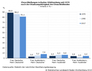 Bei 81 % der 2017 geschlossenen Ehen hatten sowohl die Frau als auch der Mann die deutsche Staatsangehörigkeit. Noch 1970 besaßen bei beinahe 9 von 10 Ehen beide Partner die deutsche Nationalität. Spiegelbildlich ist in den letzten Jahrzehnten der Anteil von Ehen zwischen Deutschen und Ausländern angestiegen – von lediglich 7 % im Jahr 1970 auf zuletzt immerhin knapp 15 %.