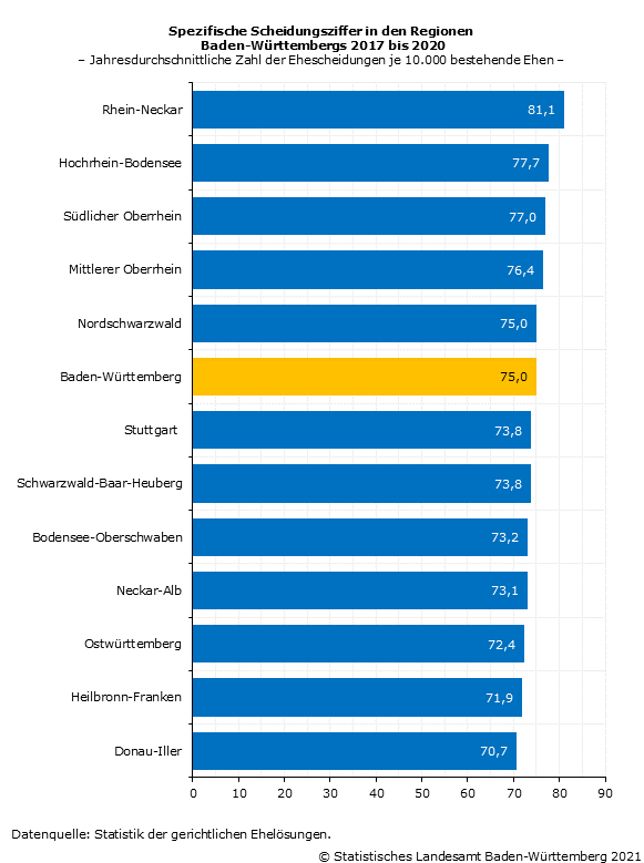 In regionaler Hinsicht zeigen sich Unterschiede im Scheidungsverhalten, die aber relativ gering ausfallen. Die wenigsten Ehen wurden zuletzt in den Regionen Donau-Iller, Heilbronn-Franken und Ostwürttemberg geschieden: Im Durchschnitt der Jahre 2017 bis 20204 kamen in diesen württembergischen Regionen jeweils 71 bzw. 72 Ehescheidungen auf 10 000 Ehen (Schaubild 3). Am höchsten war diese sogenannte spezifische Scheidungsziffer (vgl. Hinweis) in den badischen Regionen Rhein-Neckar und Hochrhein-Bodensee mit jährlich 81 bzw. 78 Ehescheidungen bezogen auf 10 000 Ehen.