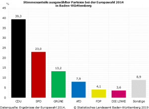 Bei der Europawahl 2014 waren in Baden-Württemberg insgesamt gut 7,7 Millionen Personen wahlberechtigt, davon entschieden sich 52,1 % für die Abgabe ihrer Stimme. Gegenüber der Europawahl 2009 hatte die Wahlbeteiligung damit nur leicht zugelegt (+ 0,1 Prozentpunkt).