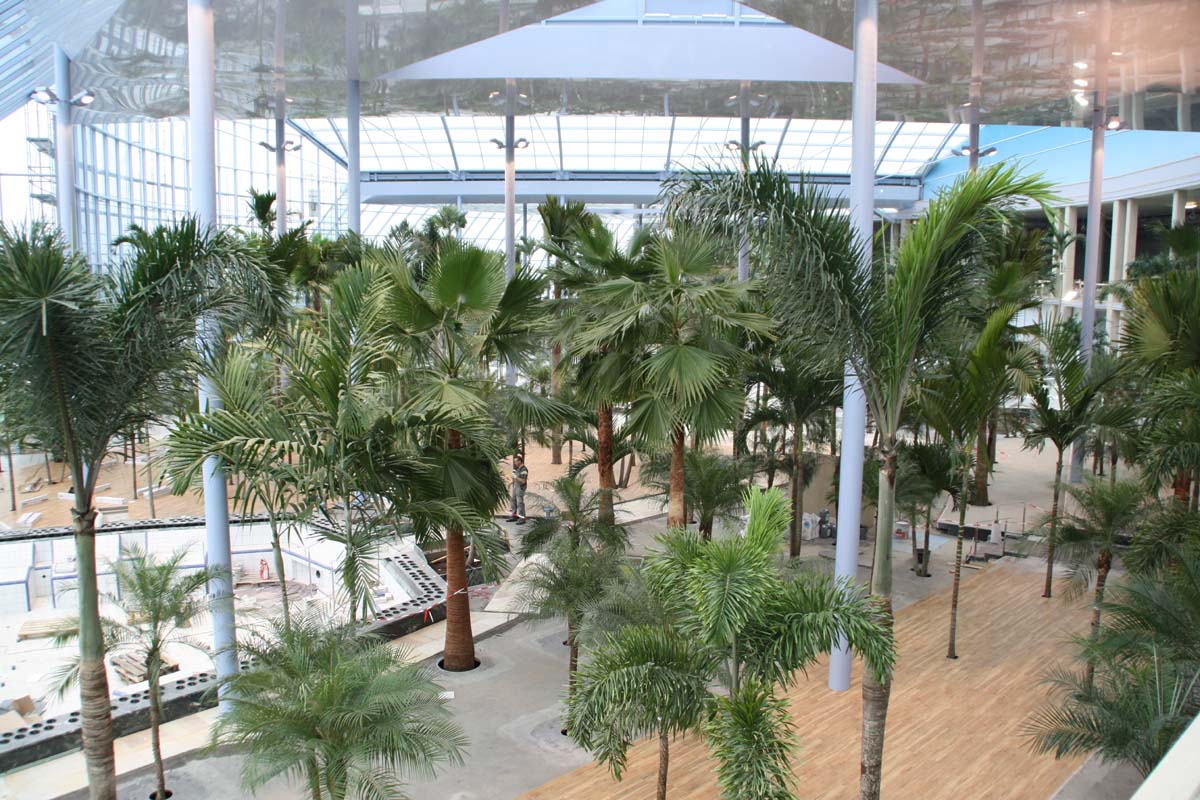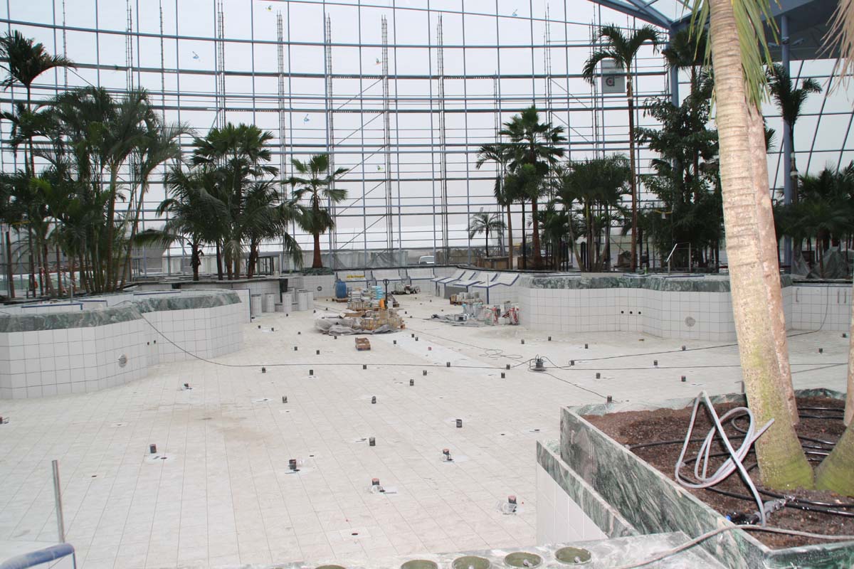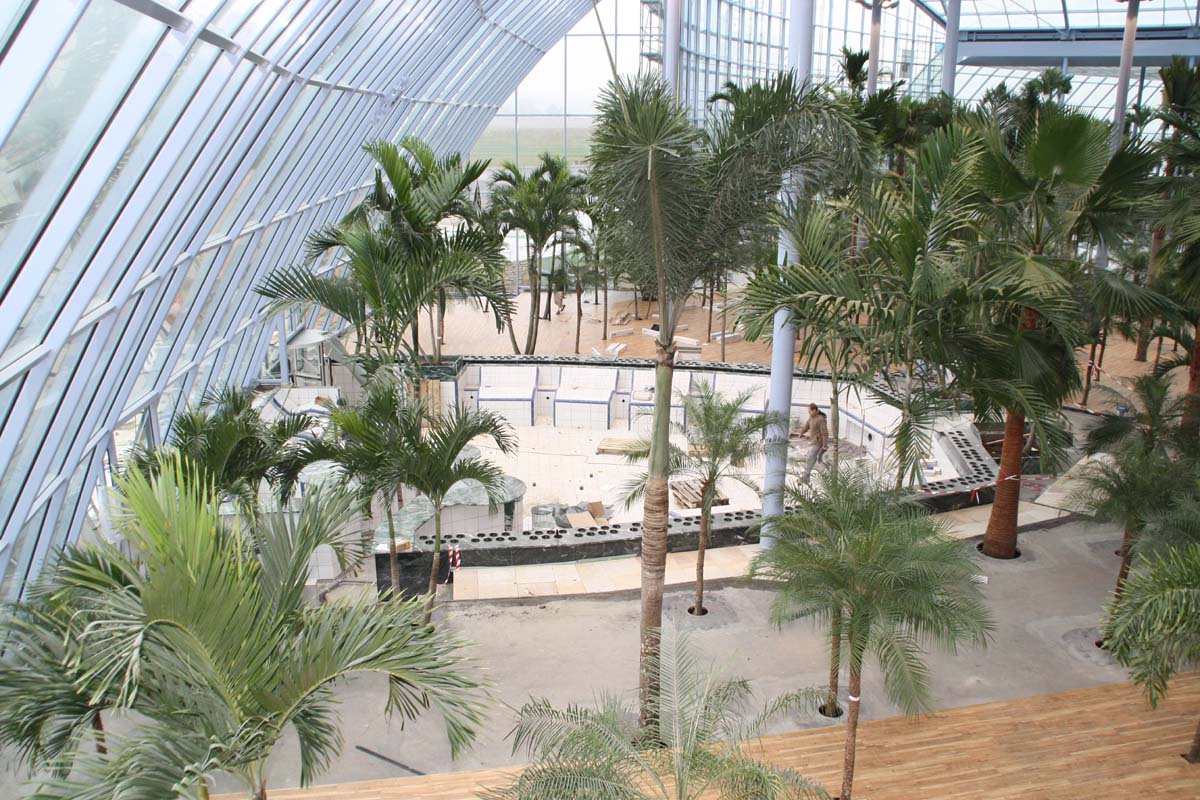 (cr) Es gibt noch viel zu tun in der Badewelt, doch der Termin zur Eröffnung am 18.12.2012 bleibt bestehen. Es ist schon fast an der Zeit die Badesachen zu richten um bei den ersten Gästen dabei zu sein. Alle Palmen haben ihren Platz gefunden. Die Bewässerung und die Belüftung der Pflanzen funktionieren einwandfrei. Der Gärtner ist bereits bei der Arbeit die Palmen regelmässig zu pflegen. Auch die Heizungsanlage läuft fehlerfrei. Jetzt muss noch jede Menge an Boden- und Wandbelägen verlegt werden. Auch im Aussenbereich wurde der 10.000 m² grosse See fertiggestellt und wartet auf Bewässerung. Die Handwerker arbeiten Hand in Hand fast rund um die Uhr. Eine kleine Reparatur steht auch schon an, denn bei dem letzten Sturm ging eine Aussenscheibe zu Bruch. Diese wird aber bis zur Eröffnung ausgetauscht werden. Auf Grund der vielen Arbeiten können zur Zeit leider nicht alle Bereiche besichtigt werden. Wir werden aber weiter über den Fortschritt berichten. Nachfolgend ein paar Impressionen.