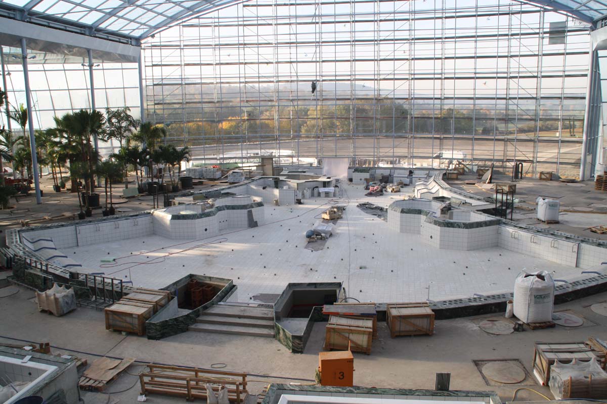 Die ersten Mitarbeiter werden bereits an anderen Orten geschult und auf ihren Einsatz im Dezember vorbereitet. Die beiden Gastronomiebereiche sind vergeben. Im Außenbereich kann man schon deutlich die Ausmaße des zu enstehenden Sees erkennen.