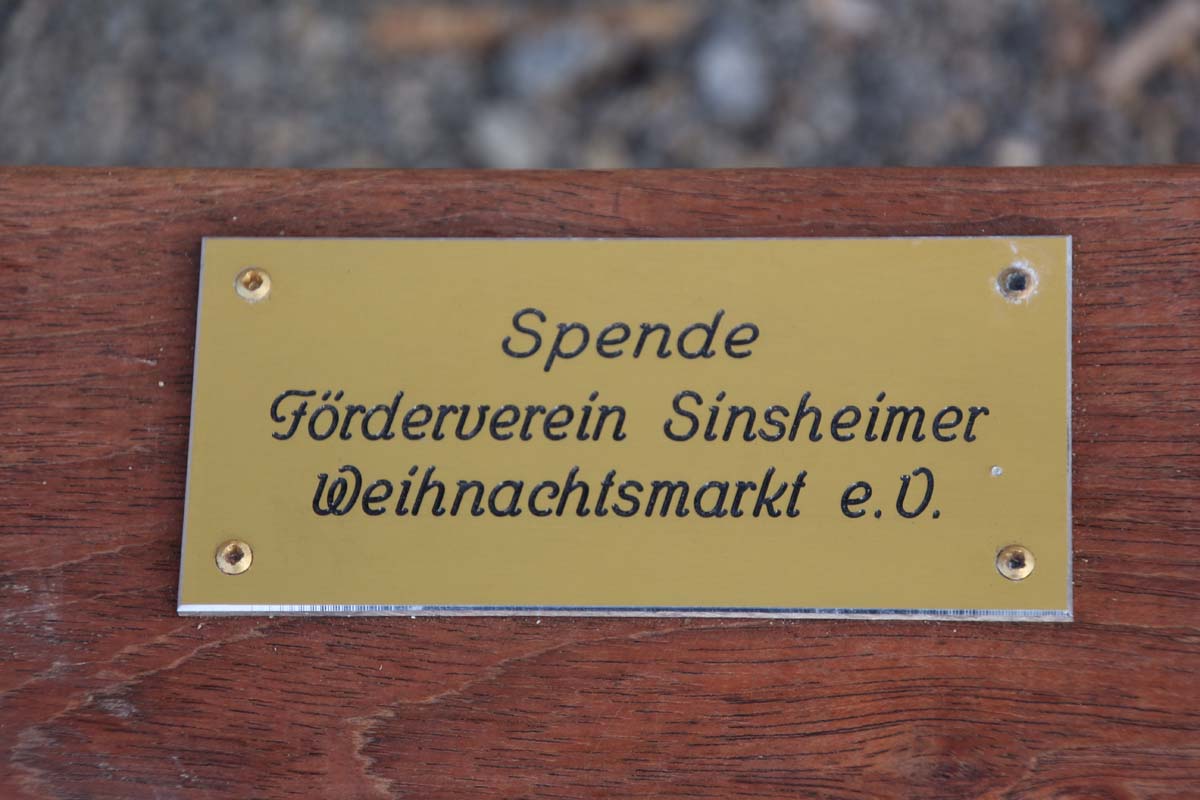 (cr) Dank der Spende dieses Vereins gibt es jetzt an der Elsenzterrasse ein Plätzchen zum ausruhen und verweilen. Diese zwei Bänke wurden von der Bevölkerung auch gerne angenommen. Jedes Jahr fördert dieser Verein gemeinnützige Organisationen, Kindergärten und vieles mehr. Mit viel ehrenamtlichen Engagement sammeln sie für vier Flohmärkte im Jahr, dann wird alles sortiert und mit viel Liebe aufgebaut. Deshalb kommen immer wieder viele Besucher auf diese beliebten Flohmärkte der Initiative Sinsheimer Weihnachtsmarkt. Das Ergebnis kann sich Jahr für Jahr sehen lassen. Diesen Verein muss man einfach lieben. Wer diesen Verein unterstützt der tut etwas für die Sinsheimer Allgemeinheit. Die nächste Gelegenheit gibt es wieder auf dem grossen Weihnachtsflohmarkt in der Elsenzehalle am Wochenende des 1. Advent. Von uns heisst es hier: Alle Daumen hoch.