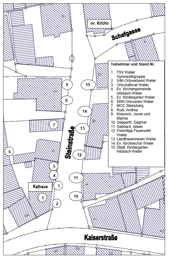 15.00 Uhr: Eröffnung durch Ortsvorsteher Manfred Wiedl und mit dem evangelischen Posaunenchor Hilsbach-Weiler vor der ehemaligen Verwaltungsstelle