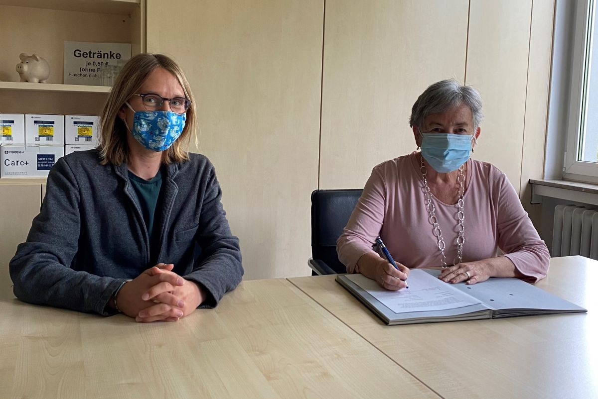 Der kommunale Behindertenbeauftragte Patrick Alberti und die Vorsitzende des Blinden- und Sehbehindertenverbands Württemberg, Angelika Moser, bei der Vertragsunterzeichnung der Kooperationsvereinbarung.