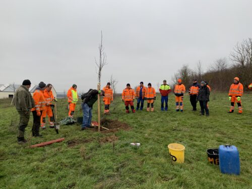 Am Nachmittag und dem ganzen Folgetag wurden die erworbenen Kenntnisse auf verschie-denen Flächen der Gemarkung Sinsheim in die Praxis umgesetzt. Zunächst wurde ein junger Birn- bzw. Apfelbaum gepflanzt. Die Teilnehmer erfuhren, wie man Wühlmäusen, Rinden-brand und Beschädigungen durch den Anbindepfahl vorbeugt. In kleinen Gruppen durften die Teilnehmer aus den Mitgliedskommunen dann selbst mit Schere und Säge junge Bäume schneiden. Es zeigte sich schnell, dass diese oft nicht ideal gewachsen sind und Hineindenken in die Entwicklung gefragt ist. Begriffe aus der Theorie wie Leitäste, Saftwaage oder „Deppen-knick“ nahmen nun Gestalt an.