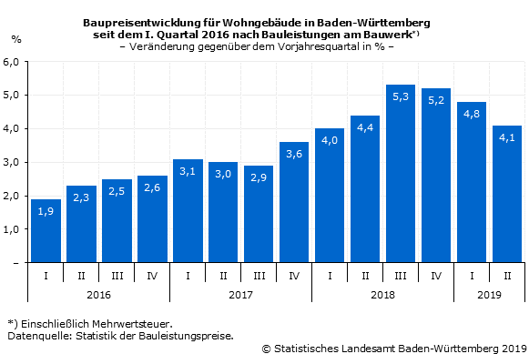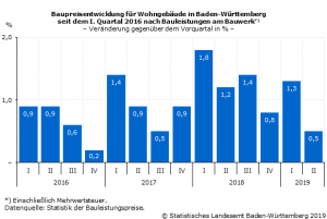 (zg) Die Preise für Bauleistungen in Baden-Württemberg haben auch im 2. Quartal zugelegt. Nach Feststellung des Statistischen Landesamtes stiegen die Bauleistungspreise für den Neubau von Wohngebäuden (Berichtsmonat Mai 2019) gegenüber dem Vorjahresquartal um 4,1 % auf einen Indexstand von 114,4 (Basis 2015=100). Allerdings hat sich die Dynamik der Teuerung etwas abgeschwächt. So lag der Preisanstieg am Bau im 1. Quartal 2019 noch bei 4,8 % und im 3. Quartal 2018 sogar bei 5,3 %.