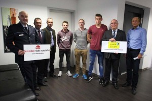 Für ihr couragiertes, selbstloses und umsichtiges Verhalten nach einem Wohnungseinbruch wurden jetzt die 17-jährigen Marco Jaksch, Daniel Grab, der 19-jährige Patrick Nagel und der 57-jährige Norbert Wittmann durch Oberbürgermeister Jörg Albrecht, den Leiter des Polizeireviers Sinsheim, Polizeioberrat Erhard Loy und das Vorstandsmitglied des Vereins Kommunale Kriminalprävention Rhein-Neckar e.V., Willi Ernst, im Rahmen der Aktion „Beistehen statt rumstehen“ geehrt.