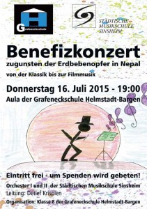Die Orchester I und II konzertieren am Donnerstag, 16.07.2015 um 19:00 Uhr in der Grafeneckschule in Helmstadt-Bargen. Der Erlös kommt der Nepal-Erdbebenhilfe zugute.