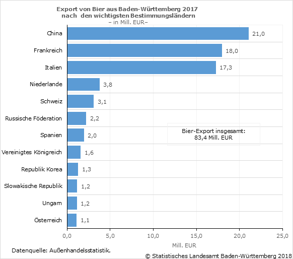 Im Jahr 2017 exportierten die baden-württembergischen Brauereien nach vorläufigen Angaben Bier im Wert von 83,4 Millionen (Mill.) Euro. Wie das Statistische Landesamt Baden-Württemberg anlässlich des Tages des deutschen Bieres mitteilt, war China mit einem Wert von 21,0 Mill. Euro der Hauptabnehmer baden-württembergischer Biere im Ausland, gefolgt vom Nachbarland Frankreich (18,0 Mill. Euro) und Italien (17,3 Mill. Euro). Die Exporte in diese drei Staaten machten allein gut zwei Drittel der gesamten baden-württembergischen Bier-Exporte aus.