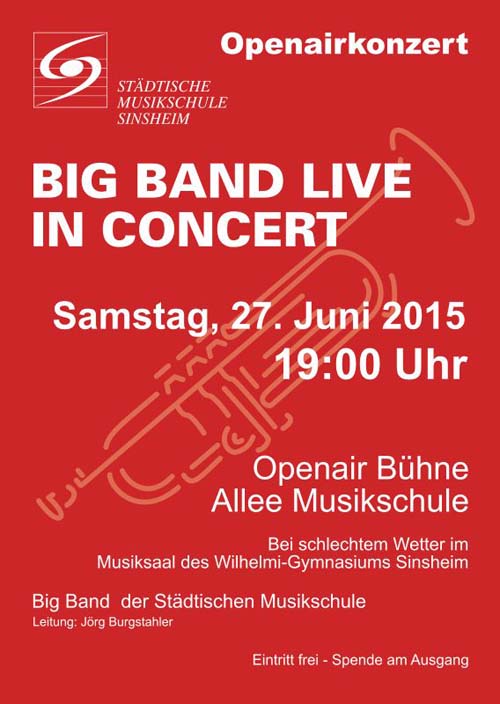 Unter dem Motto „Bigband live in Concert“ präsentiert die Bigband der Musikschule am Samstag, 27. Juni 2015 um 19:00 Uhr auf der Alleebühne neben der Musikschule ihr neues Programm. Unter der Leitung von Jörg Burgstahler sind Latin-, Swing-, Rock- und Pop-Titel zu hören und werden für beste Unterhaltung sorgen. Alle Freunde der Bigband Musik werden bei diesem Openairkonzert in der lauschigen Allee auf ihre Kosten kommen.