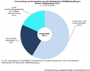 Knapp 204 000 Tonnen (t) Kompost aus der biologischen Behandlung von organischen Abfällen in Baden-Württemberg wurden im Jahr 2017 in der Land- und Forstwirtschaft eingesetzt, so das Ergebnis der abfallstatistischen Erhebungen des Statistischen Landesamtes. Mit dem Kompost werden Nährstoffe aus dem Bioabfall wieder der landwirtschaftlichen Produktion zugeführt und Nährstoffkreisläufe geschlossen. Dadurch reduziert sich der Bedarf an synthetischen Düngemitteln. Darüber hinaus trägt Kompost zur Bodenverbesserung bei.