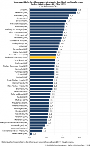 Die Bevölkerung Baden-Württembergs dürfte bis zum Jahr 2035 auf 11,37 Millionen Einwohner wachsen. Gegenüber dem Jahr 2017 entspräche das einem Plus von 3,1 %. Die neu erschienenen Ergebnisse der regionalisierten Bevölkerungsvorausrechnung des Statistischen Landesamtes Baden-Württemberg zeigen, dass von diesem Wachstum alle Stadt- und Landkreise des Landes profitieren. Am stärksten profitieren vom Bevölkerungsanstieg die Stadtkreise Ulm (+5,8 %), Karlsruhe (+5,6 %) und Mannheim (+4,8 %) sowie der Landkreis Tübingen (+4,7 %). Am schwächsten entwickeln sich jene Kreise, in denen verhältnismäßig viele ältere Personen wohnen: Baden-Baden wächst bis 2035 voraussichtlich um +0,2 %, der Bodenseekreis und der Schwarzwald-Baar-Kreis jeweils um +1,5 %. In diesen Kreisen trifft eine niedrige Geburtenrate auf eine kleine Anzahl an jungen Einwohnerinnen und Einwohnern. Dies bewirkt zusammen mit einer höheren Sterberate diese abgeschwächte Entwicklung, die nur durch Zuwanderung im positiven Bereich verbleibt.
