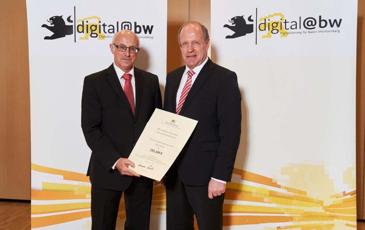Aus den Händen des Staatssekretärs im Ministerium für Inneres, Digitalisierung und Migration, Wilfried Klenk, nahm Klaus Lauer vom Zweckverband High-Speed-Netz Rhein-Neckar kürzlich den Förderbescheid in Empfang. „Der Rhein-Neckar-Kreis stellt sich dem digitalen Zeitalter. Nun ist es gelungen, die bestmöglichste Landesförderung für die Anbindung der beiden kreiseigenen Schulen zu erhalten“, freut sich Klaus Lauer.