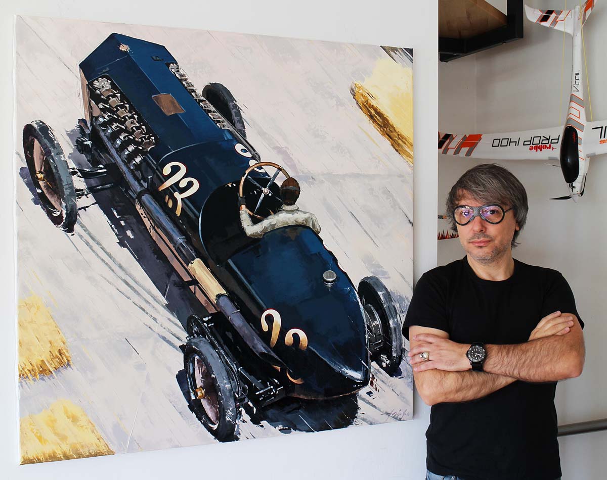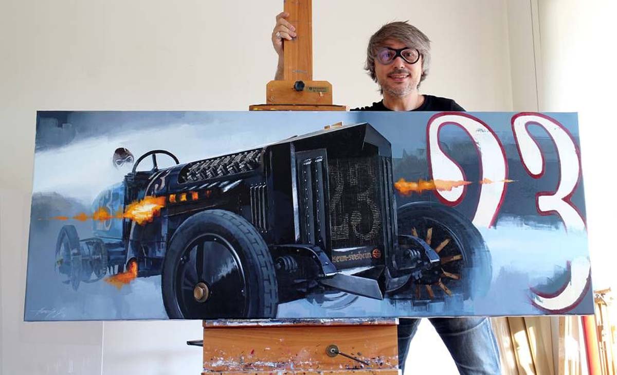 (zg) Seit Jahren lockt das Experimentalfahrzeug die Besucher ins AUTO & TECHNIK MUSEUM SINSHEIM. Ob auf Platzveranstaltungen oder im TV – der Spezialrennwagen fasziniert! Das zigarrenförmige Fahrzeug mit einem eingebauten 12-Zylinder-Flugmotor versetzt die Menschen immer wieder in Staunen. Denn es lässt sich nur erahnen, was für eine Power dahinter stecken muss, um eine Dauerleistung von 550 PS bei 1530 Upm zu erreichen. Eben diese Power inspirierte den Künstler bei seinem zweiten Gemälde, die brachiale Motorleistung habe ihn eben schon immer beeindruckt. Die Kraft, die der Fahrer aufbringen müsse, um dieses ungewöhnliche Fahrzeug in einer schnellen Kurve zu bändigen. Die Vogelperspektive schräg von oben hatte er dabei gezielt gewählt – so sei die Dynamik zu spüren. „Außerdem kann man so auch, einerseits die gewaltige Größe dieses Ungetüms, aber auch die schlichte Zigarrenform seiner Karosserie genießen und neues entdecken – Faszination Mensch, Maschine und Kunst“, kommentierte Hasip Girgin seine Motivation.