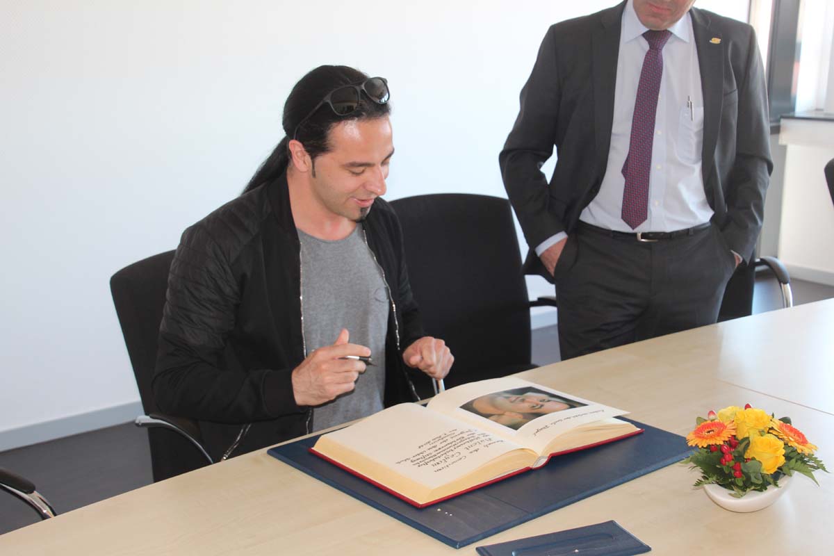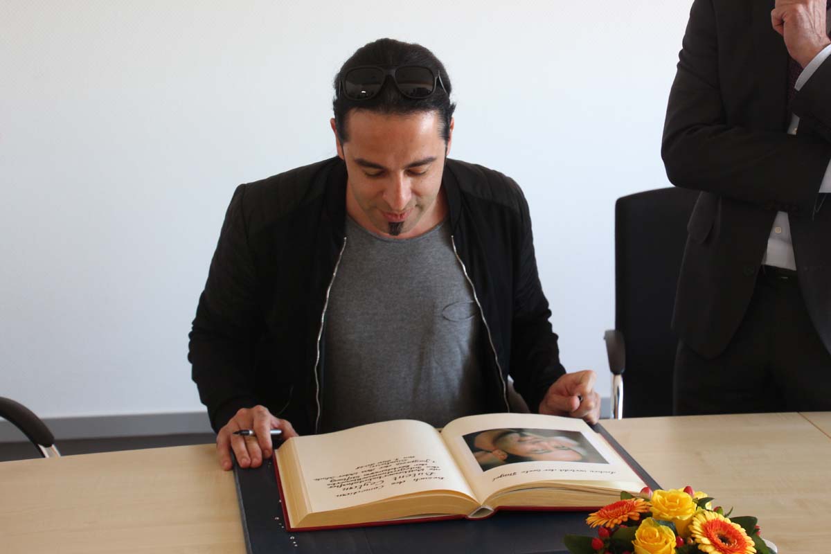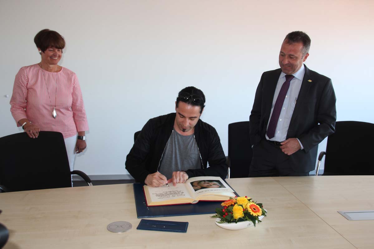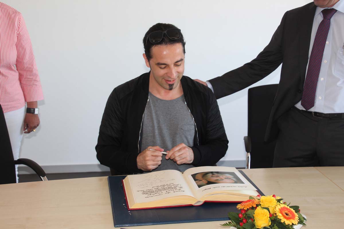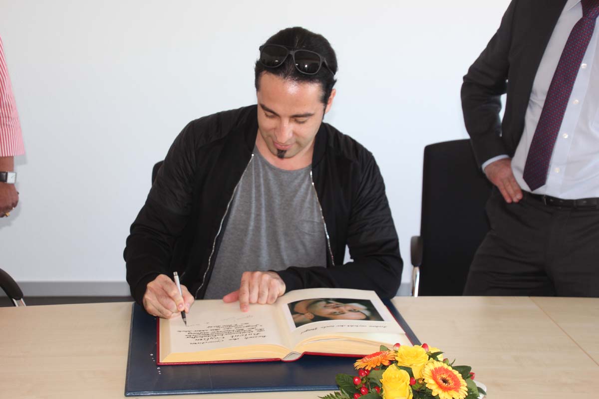(cr) Normalerweise erlebt man Bülent Ceylan nur auf den grossen Bühnen in Deutschland. Doch bei seinem Besuch im Sinsheimer Rathaus lernte man ihn mal von seiner ganz privaten Seite kennen. Er ist bodenständig geblieben, eher etwas zurückhaltend begrüsste er die Gäste im Rathaus zum Eintrag ins goldene Buch der Stadt. Doch zwischen ihm und Ali J. Albrecht stimmte sofort die Chemie. Und so wurde aus dem Eintrag in das Goldene Buch ein ganz amüsanter Event. Trotz Termindruck erfüllte ere auch gerne die Autogrammwünsche der städischen Angestellten. Besonders bemerkenswert ist auch seine soziale Ader. Bülent Ceylan ist einfach der geblieben der er ist.