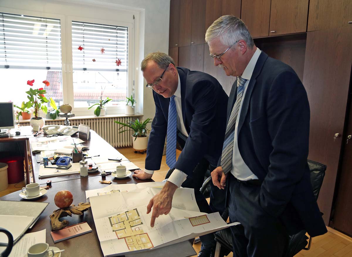 „Man muss da hingehen, wo die Menschen sind und ihnen zuhören. Nur so erfährt man, wo der Schuh drückt“, sagte Schütte, der in seiner Heimatgemeinde Bammental seit über 10 Jahren Gemeinderat ist. Dem stimmte Bösenecker, der großen Wert auf ein offenes Rathaus legt, ausdrücklich zu. Mit Blick auf den Umbau des Rathauses, der insgesamt 2,2 Mio. Euro kosten wird, erläuterte das Gemeindeoberhaupt, dass sich sein zukünftiges Bürgermeisterzimmer direkt neben dem Hauptamt und dem Bürgerbüro befinden werde: „Das habe ich ganz bewusst so gewählt, so gibt es ganz kurze Wege. Ich bin jederzeit für die Bürger da.“