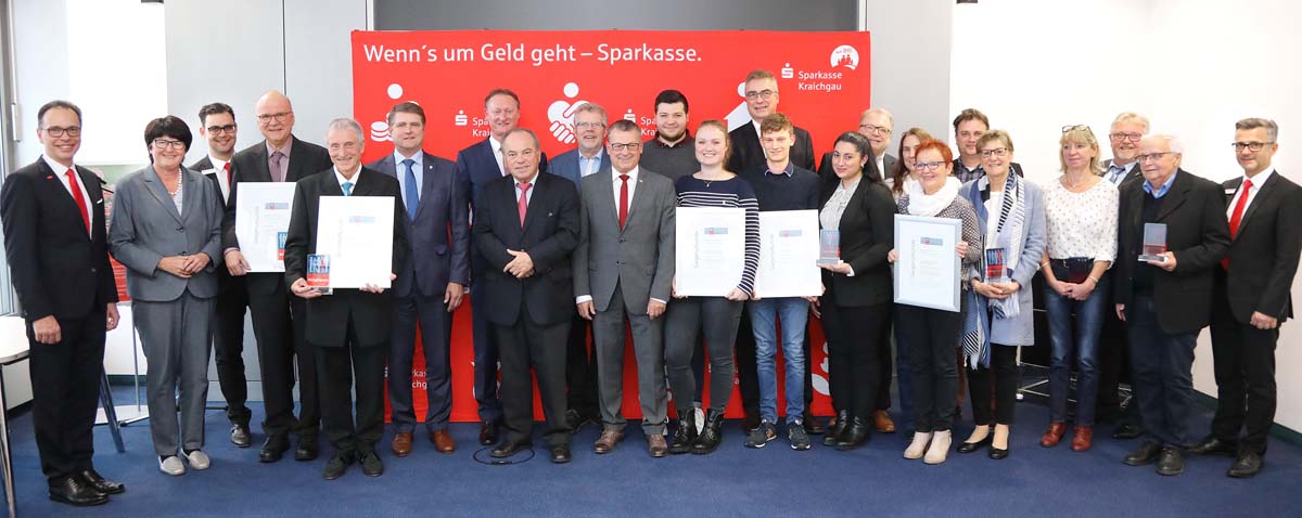 Die Preisträgerinnen und Preisträger des Bürgerpreises 2018 zusammen mit Vertretern der Sparkasse Kraichgau und der Kommunen.