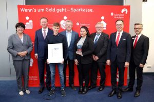 Maria Karnemidou und Lukas Heß (3. v. l.) aus Sinsheim wurden von der Sparkasse Kraichgau und Vertretern der Kommunen mit einem Bürgerpreis in der Kategorie „U21“ geehrt.