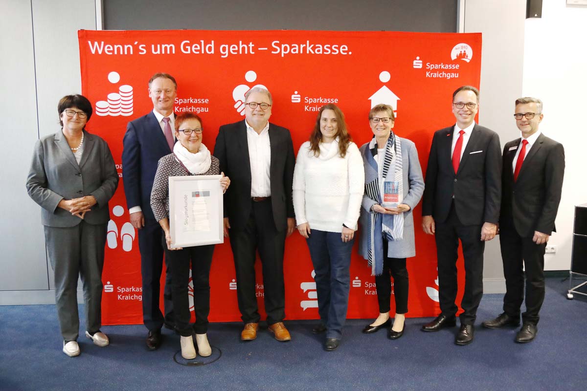 Rosemarie Kohler (3. v. l.) und Angelika Heller (3. v. r.) vom Generationennetzwerk Neckarbischofsheim wurden von der Sparkasse Kraichgau und Vertretern der Kommunen mit einem Bürgerpreis in der Kategorie „Alltagshelden“ geehrt.