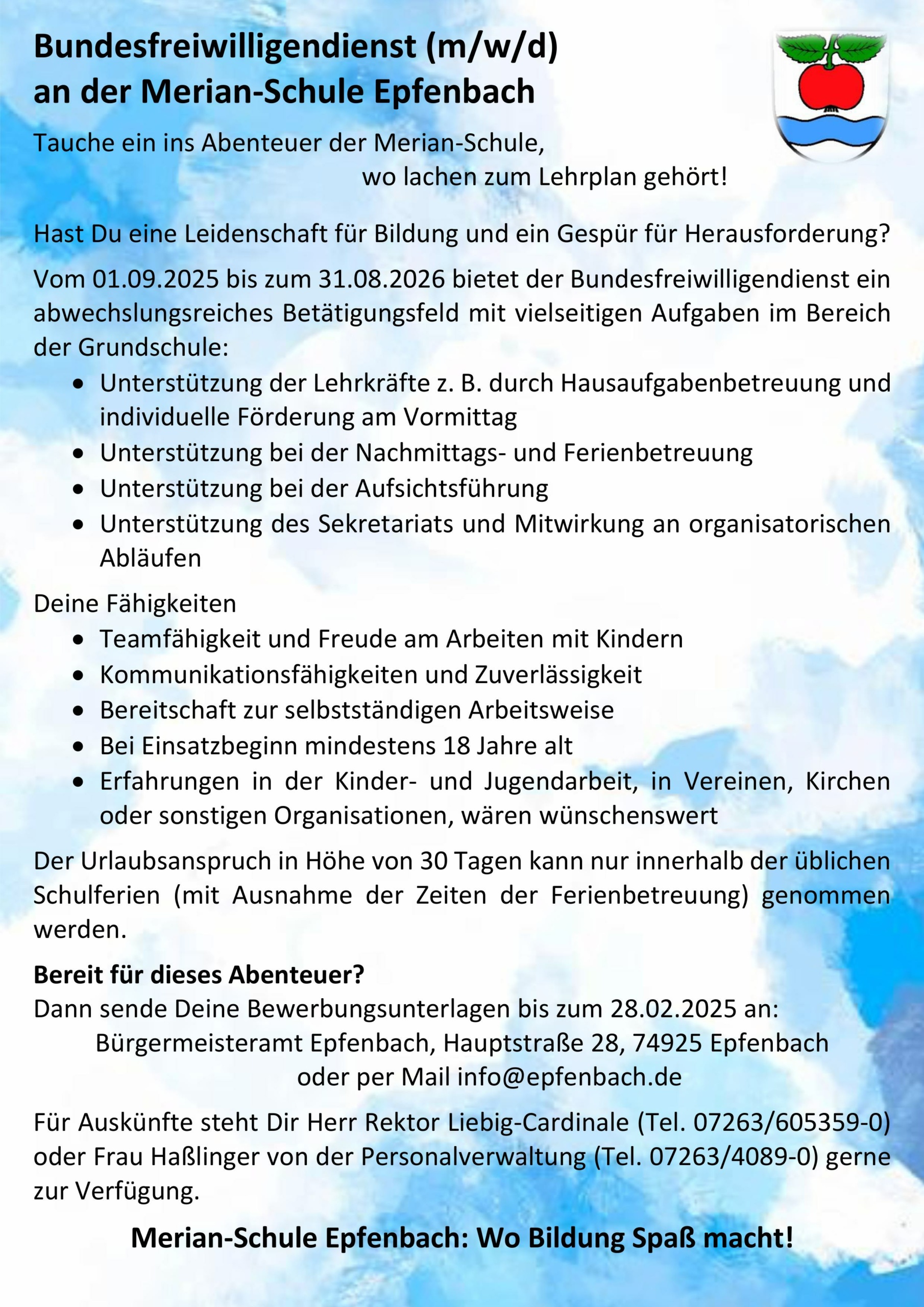 Die Merian-Schule Epfenbach bietet vom 1. September 2025 bis zum 31. August 2026 eine Stelle im Rahmen des Bundesfreiwilligendienstes an. Gesucht werden engagierte Personen, die Freude an der Arbeit mit Kindern haben und das Team der Grundschule unterstützen möchten.